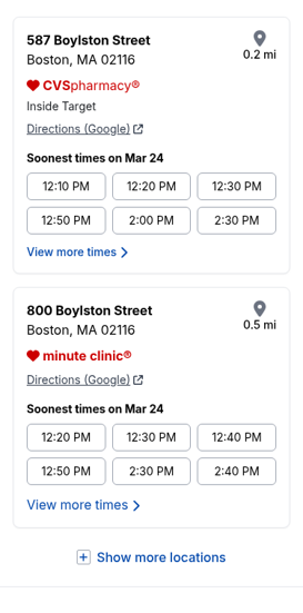 - When Pharmacy and MinuteClinic share an address or distance, the site with the most soonest times appeared first; ties rotated for balance between business units.