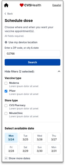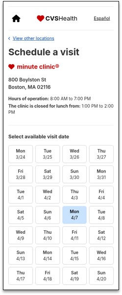 Leveraged the recently redesigned MinuteClinic Appointment Picker for Unified Scheduling, keeping the critical elements patients relied on and adding new enterprise and store‑type cues to provide clarity and increase confidence in patient selections.