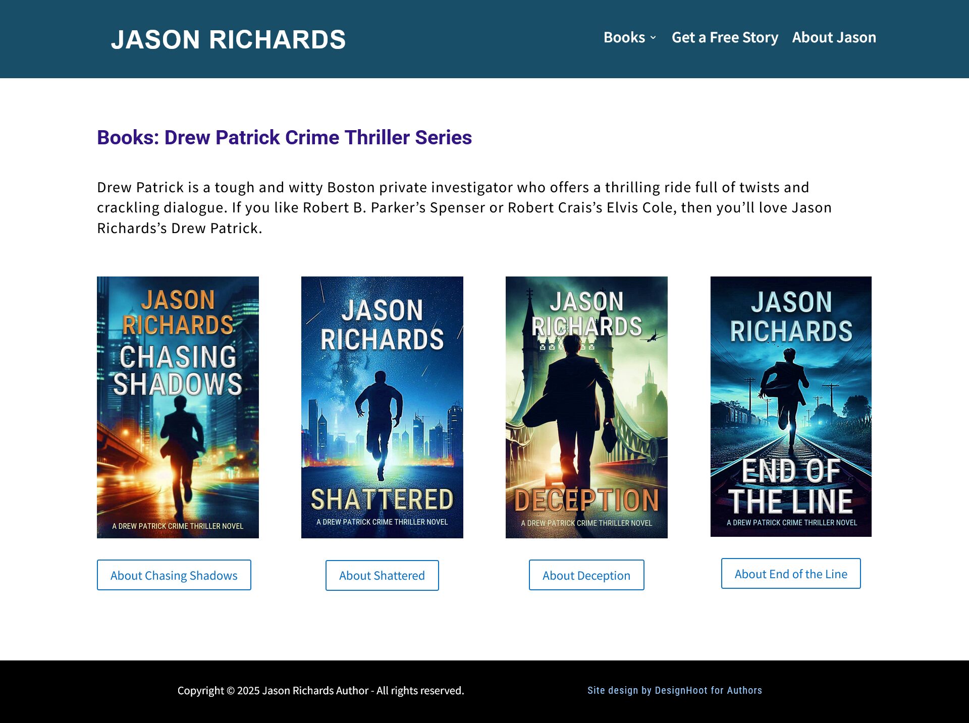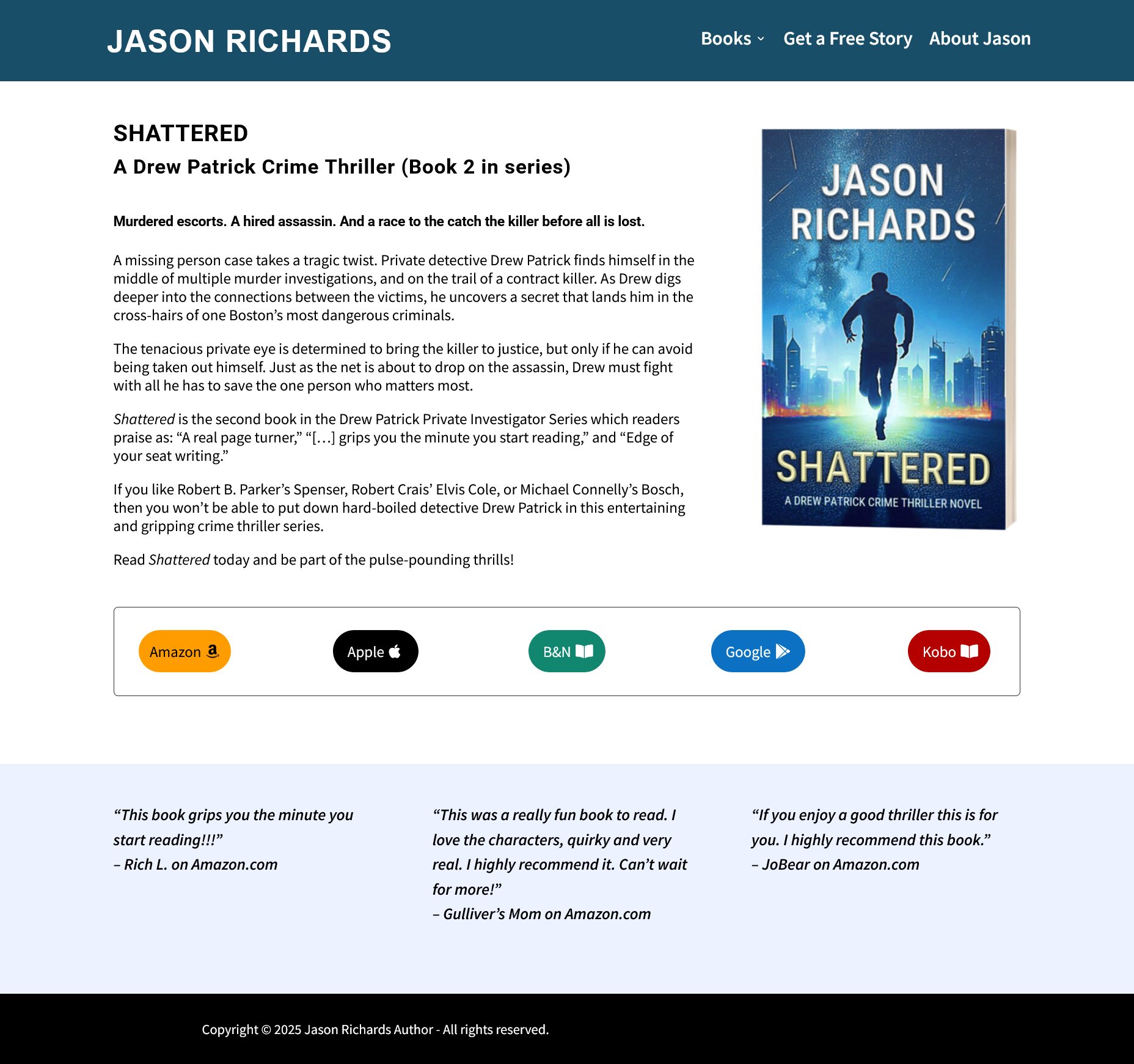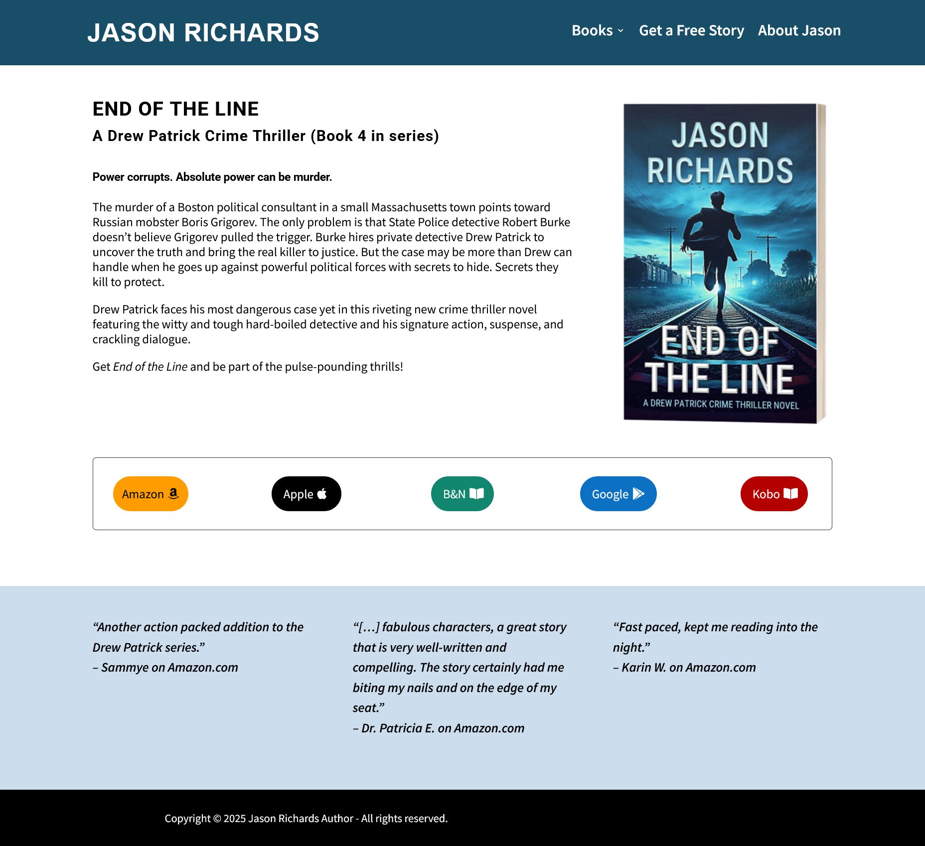 There are millions of books and thousands of authors, so when Wheelhouse Publishers (my publishing company) was ready to launch new thriller author Jason Richards and his book series, I knew we needed a website to promote his brand and books to readers across the digital devices they use daily.