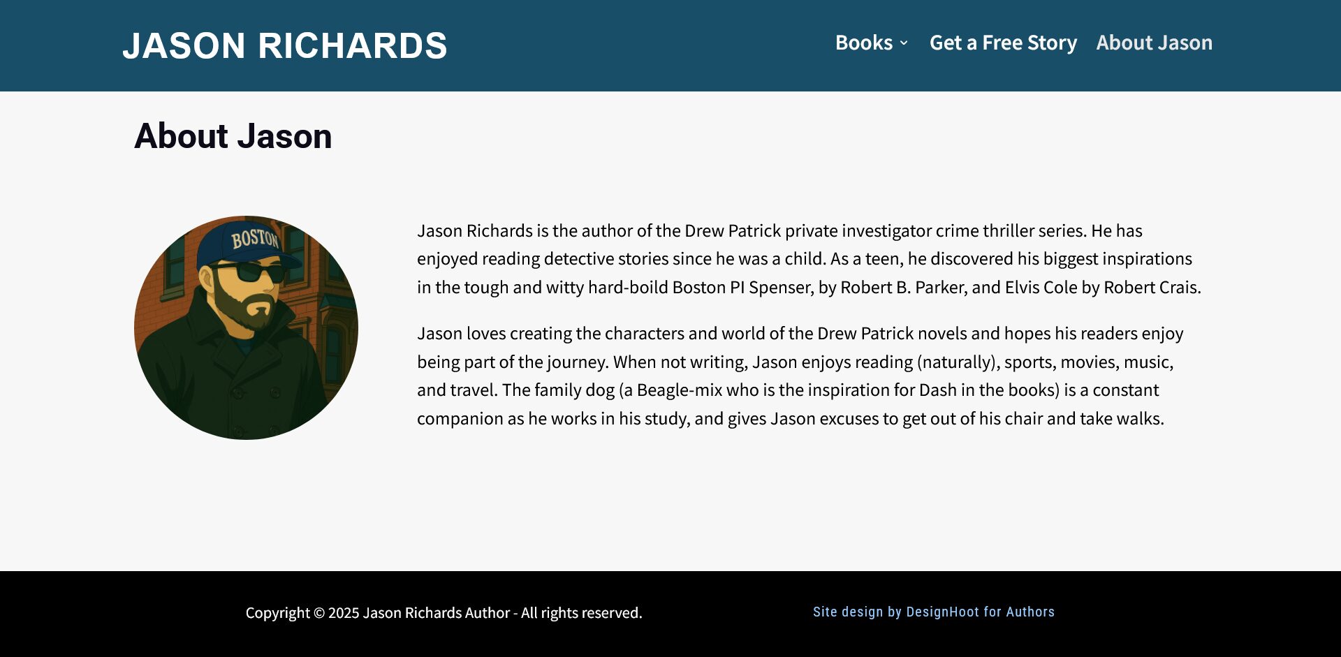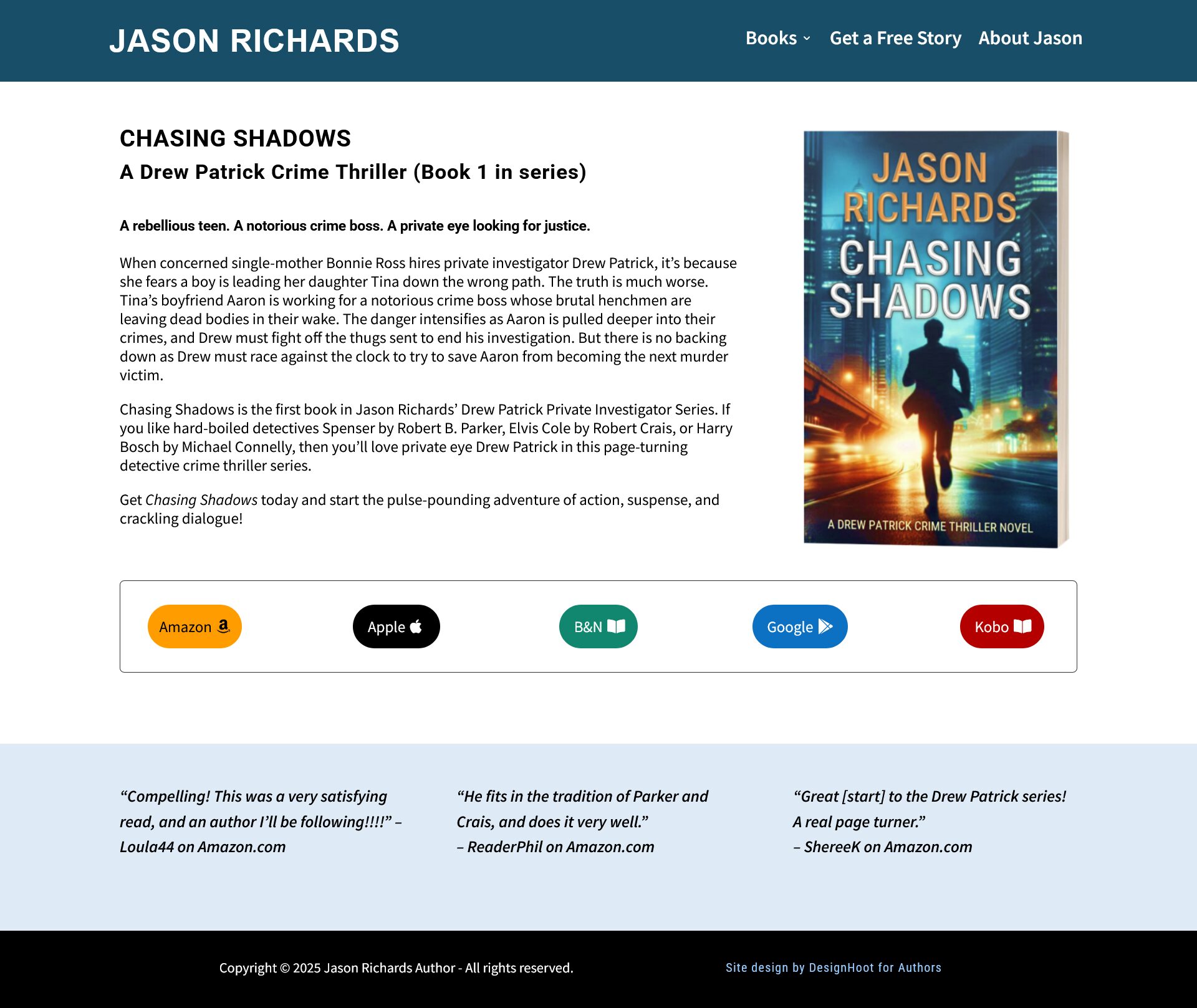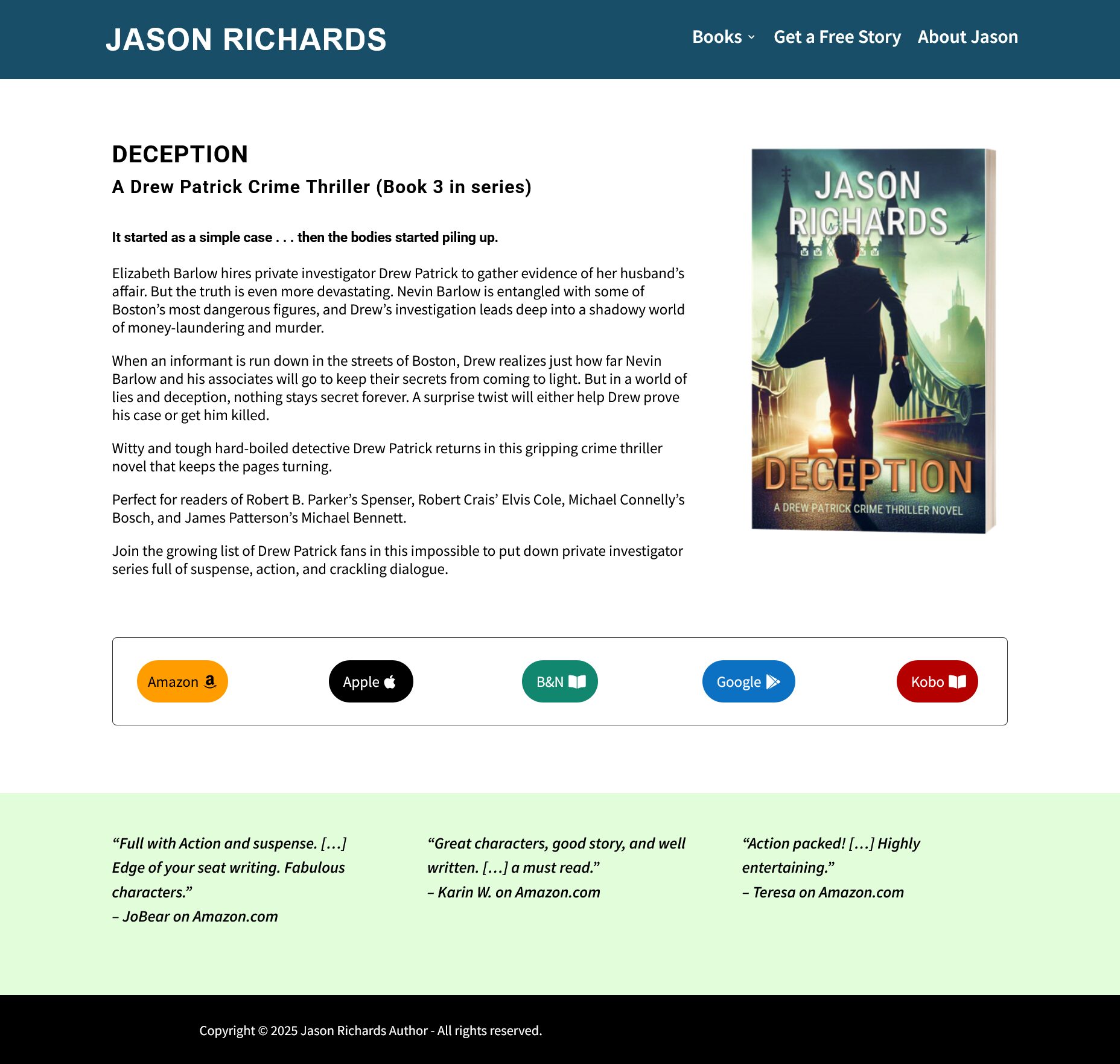 There are millions of books and thousands of authors, so when Wheelhouse Publishers (my publishing company) was ready to launch new thriller author Jason Richards and his book series, I knew we needed a website to promote his brand and books to readers across the digital devices they use daily.