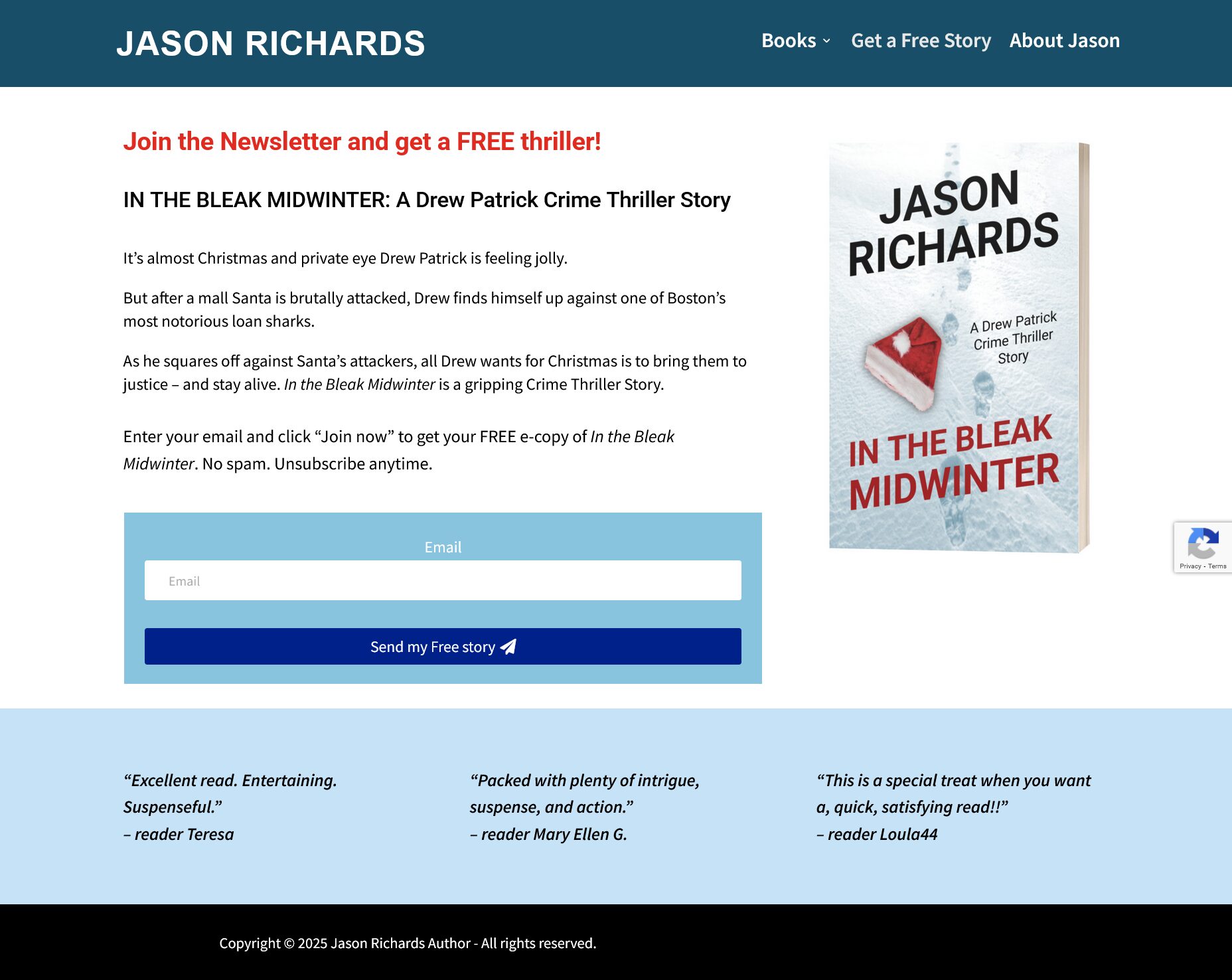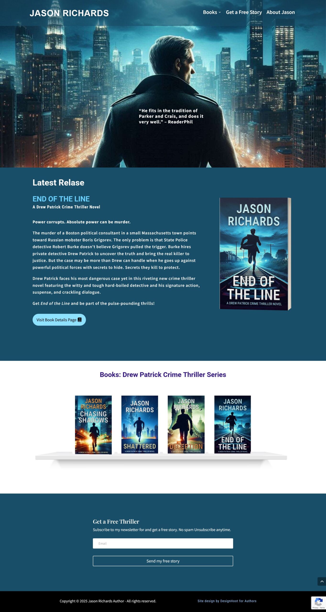 Designed Crime Thriller author Jason Richards’s website that helpled him grow his author brand by meeting genre reader expectations in the design and allowing users to access information without friction.