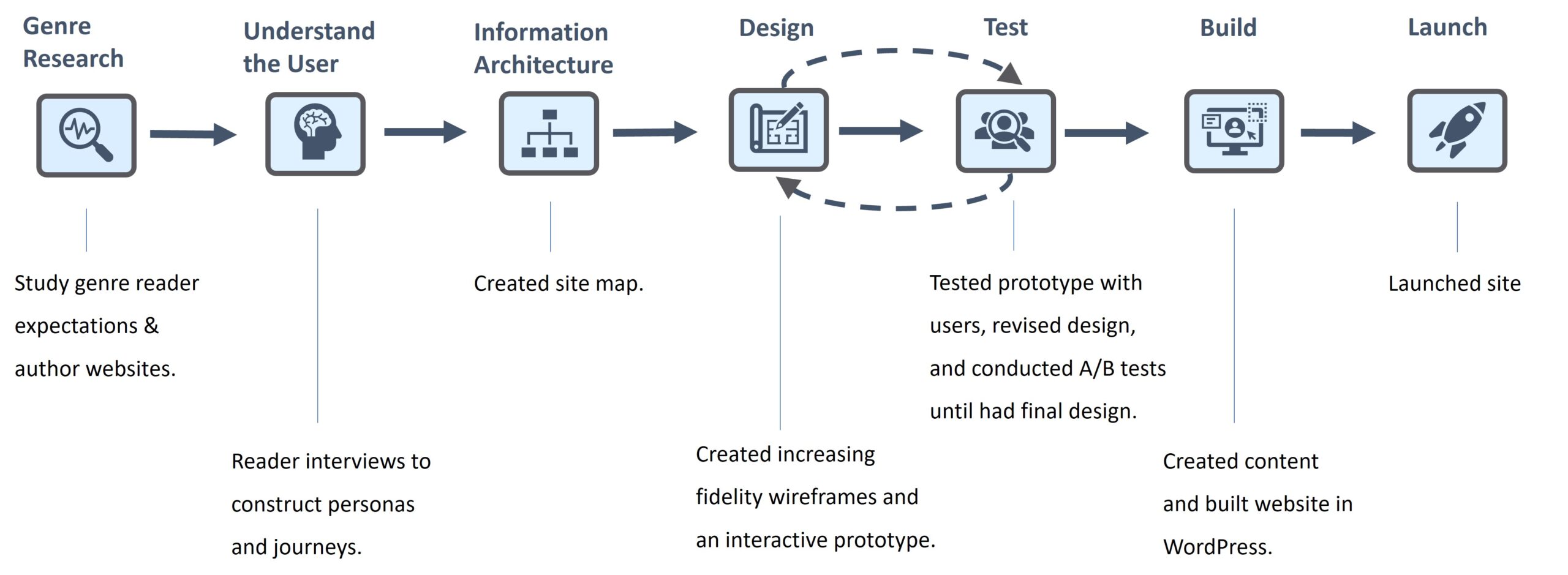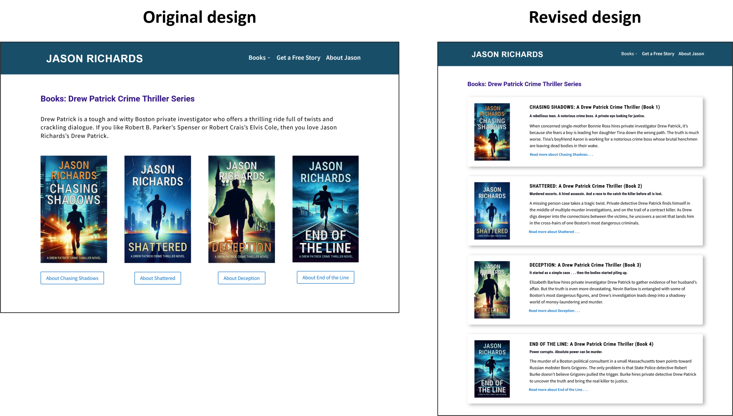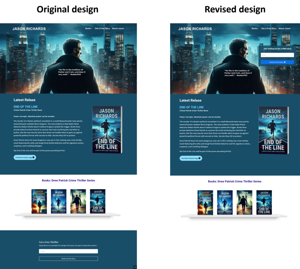 I did a competitive analysis of 3 bestselling independent thriller author websites to get design inspiration and look for points of similarity and difference in thinking about designing Jason’s website.