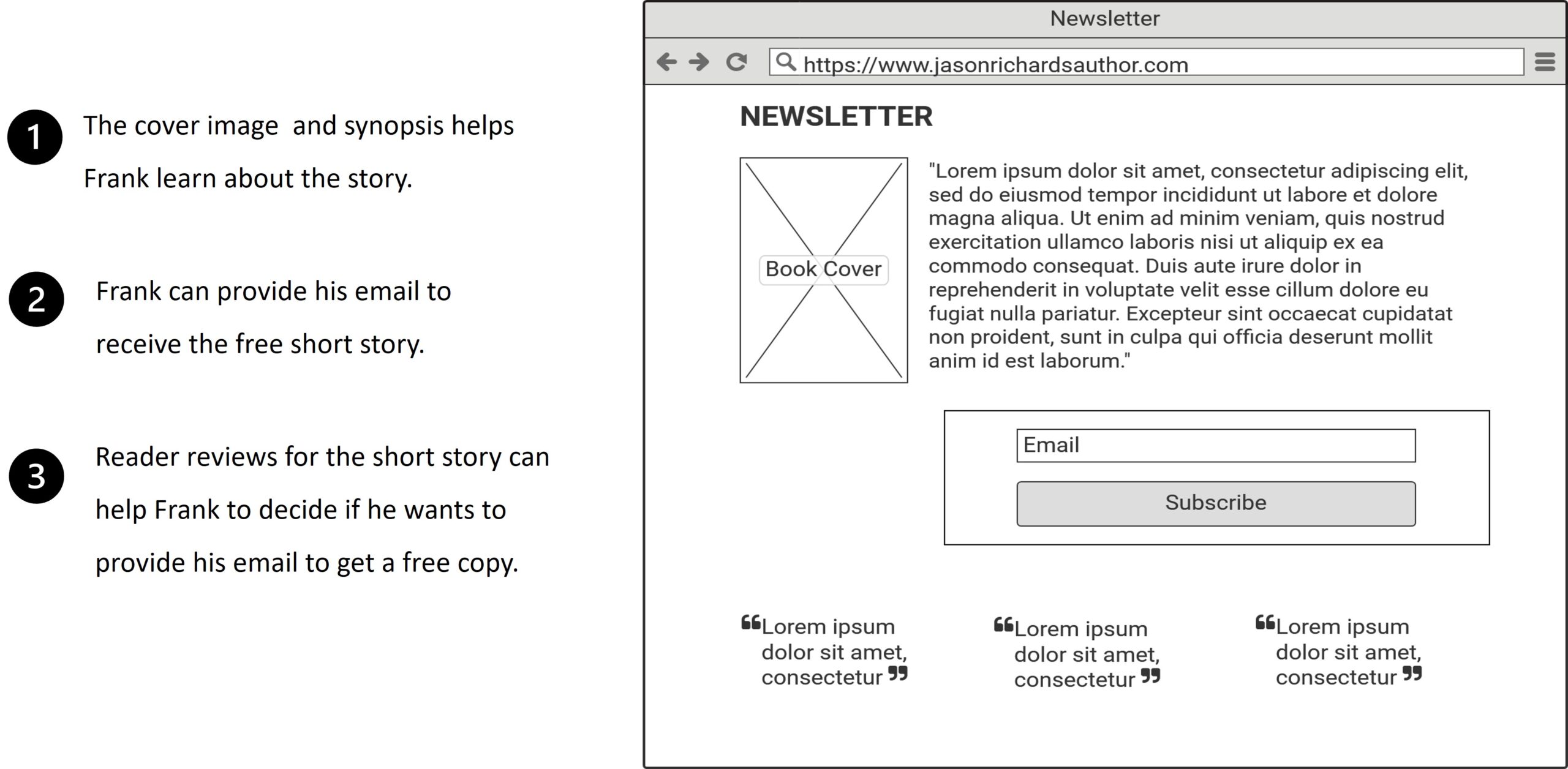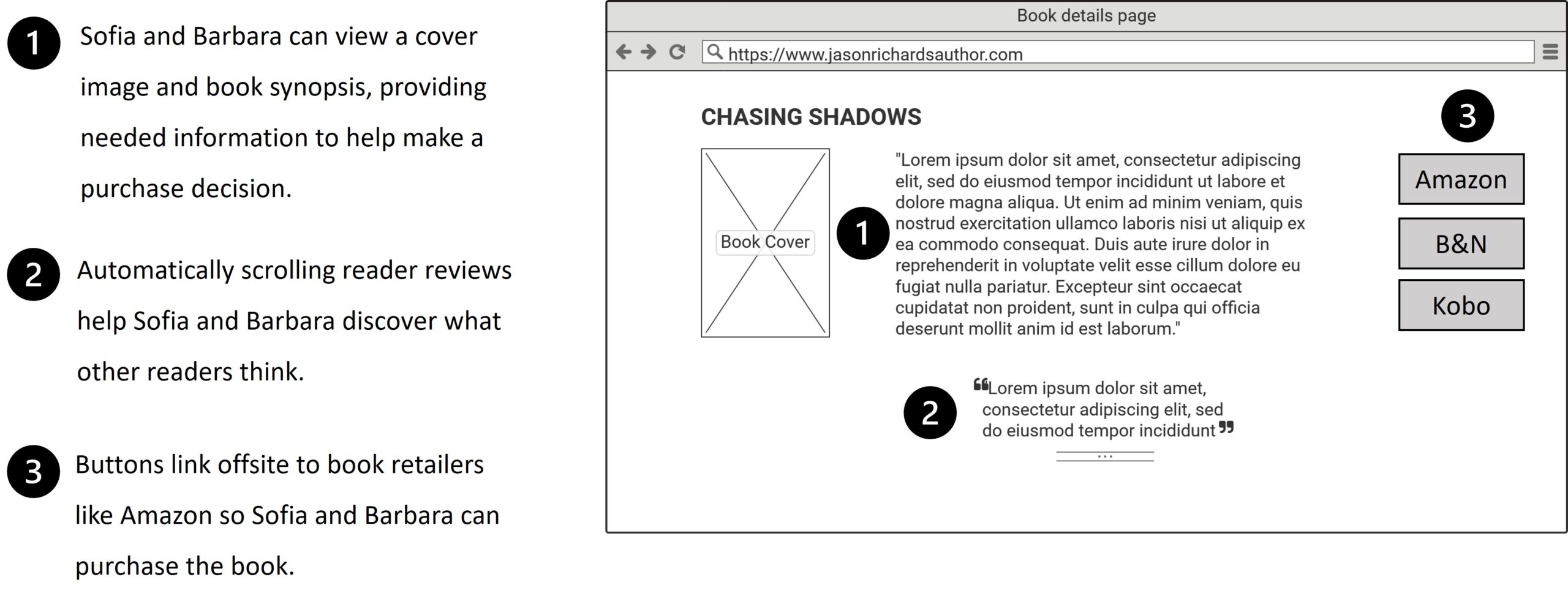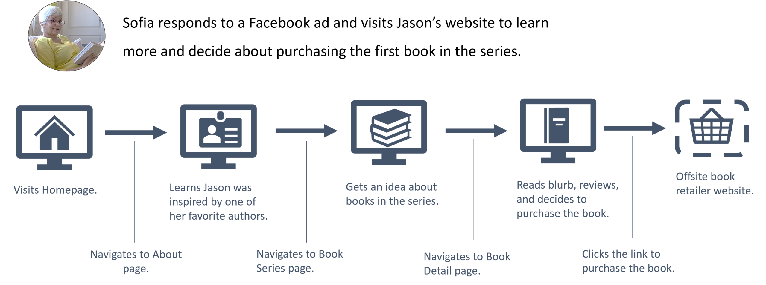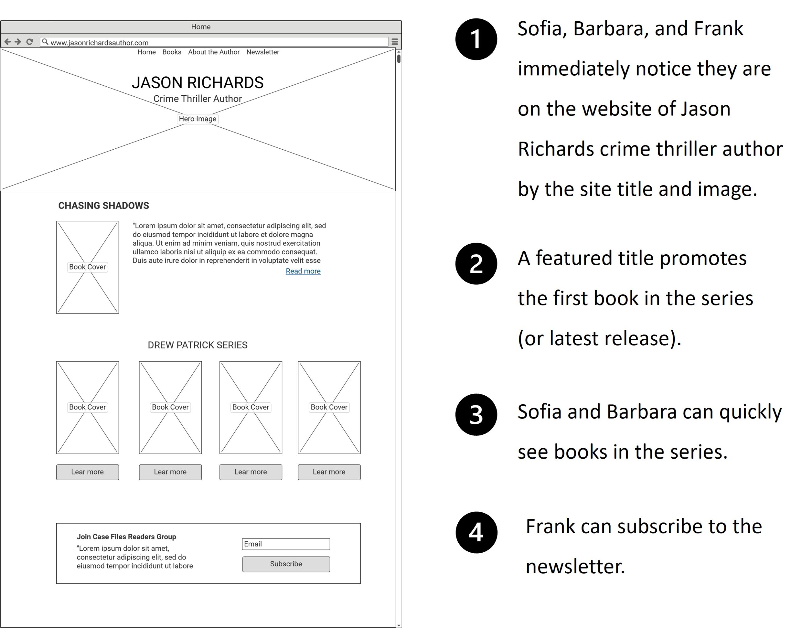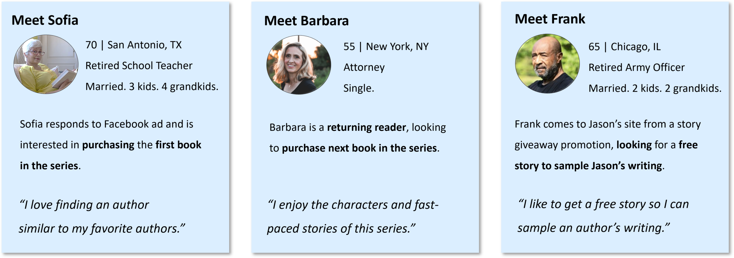 After analyzing market research and gathering reader insights from over 100 book marketing campaigns, I created the personas of Sofia, Barbara, and Frank to represent the 3 primary types of readers Jason can expect for his website.
